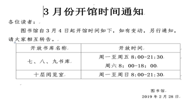 开馆通知20190222时间:2019年02月22日信息来源:本站原创点击:次【 加入收藏 】【 字体:大 中 小 】各位读者: 2019年2月25日—3月3日为图书馆还书时间,届时,图书馆七、八、九层书库晚间、中午暂不开放,十楼白天正常开放。自2019年3月4日起图书馆所有库室恢复正常开馆时间。请各位读者抓紧时间将假期所借图书在开学一周内清还,逾期不还或丢失者按图书馆相关规定处罚。请各位读者相互转告!图书馆2019年2月22...