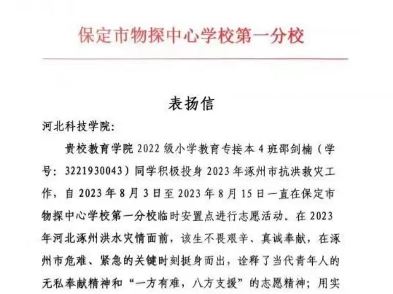 近日,我校接到保定市物探中心学校第一分校的一封表扬信,信中对我校邵剑楠同学在抗洪救灾志愿服务中的贡献提出表扬并表示感谢。 在2023年8月3日至2023年8月15日期间,我校教育学院2022级小学教育专接本4班邵剑楠同学...
